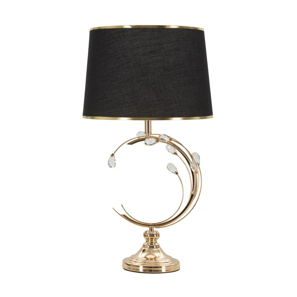 Lampada da tavolo in metallo dorato con decorazione geometrica con eleganti applicazioni che ricordano dei fiori. Completa di paralume in tessuto nero con finiture dorate.
