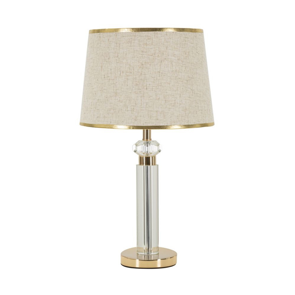 Elegante lampada da tavolo in metallo dorato con applicazioni trasparenti. Completa di paralume in tessuto beige con finiture dorate.