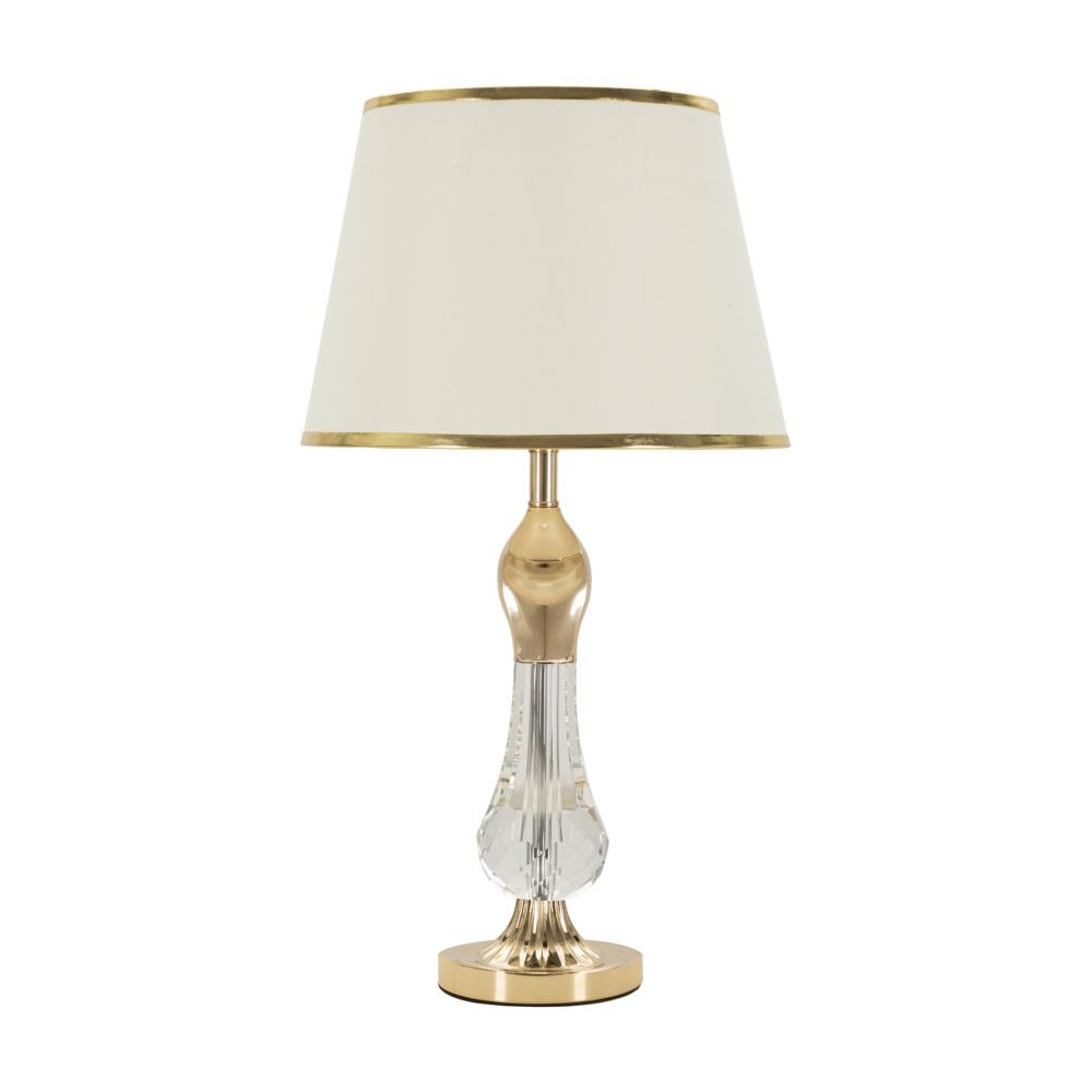 Elegante lampada da tavolo in metallo dorato con applicazioni trasparenti. Completa di paralume in tessuto beige con finiture dorate.
