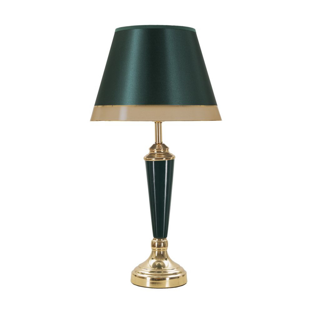 Elegante lampada da tavolo in metallo dorato con applicazioni verdi. Completa di paralume in tessuto beige con finiture dorate.