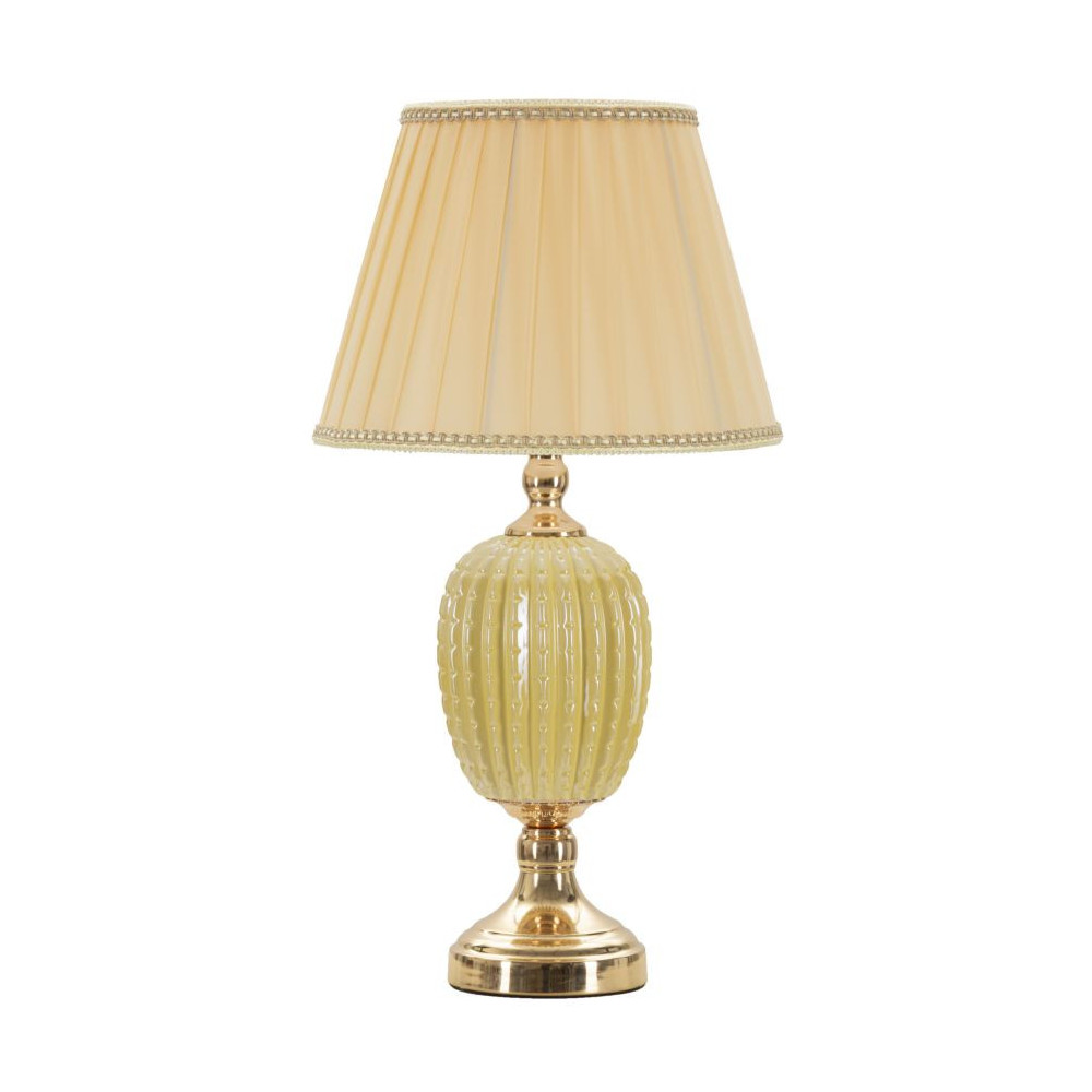 Elegante lampada da tavolo in metallo dorato con applicazioni beige. Completa di paralume in tessuto beige con finiture dorate.