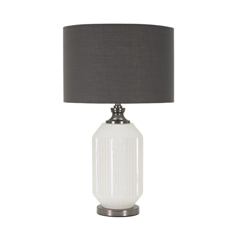 Lampada da tavolo elegante con base di vetro bianca e paralume in velluto grigio sprigiona modernità, perfetta per illuminare con stile ogni angolo della tua casa.