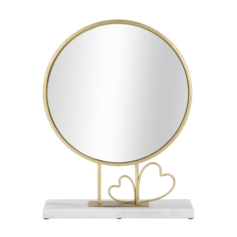 Specchio rotondo da tavolo con cornice in metallo dorato e base in marmo bianco impreziosito da un elegante coppia di cuori.