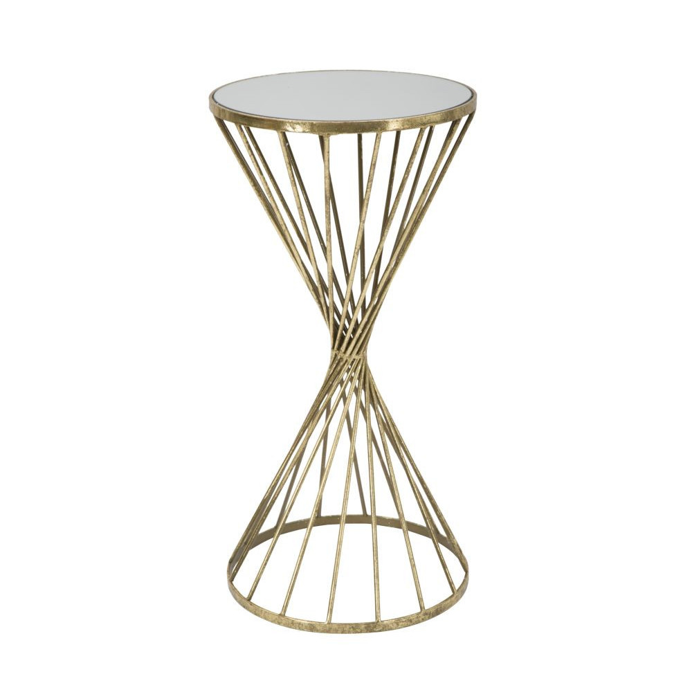 Tavolinetto rotondo in metallo e vetro. Il dorato abbinato al vetro crea un forte impatto. Un elemento lussuoso e glam per la tua casa