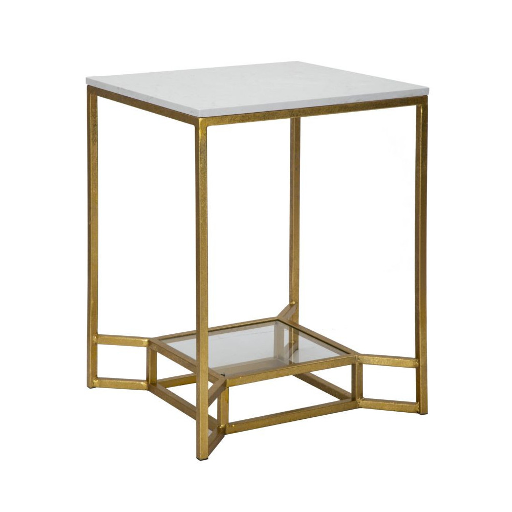 Tavolo da caffè quadrato in metallo dorato con piano in marmo bianco e ripiano inferiore in vetro. Le linee geometriche e squadrate della struttura in metallo dorato si fondono alla perfezione con l'eleganza del vetro e del marmo bianco per rendere speciale ogni living.