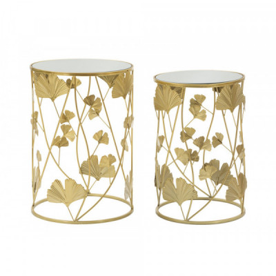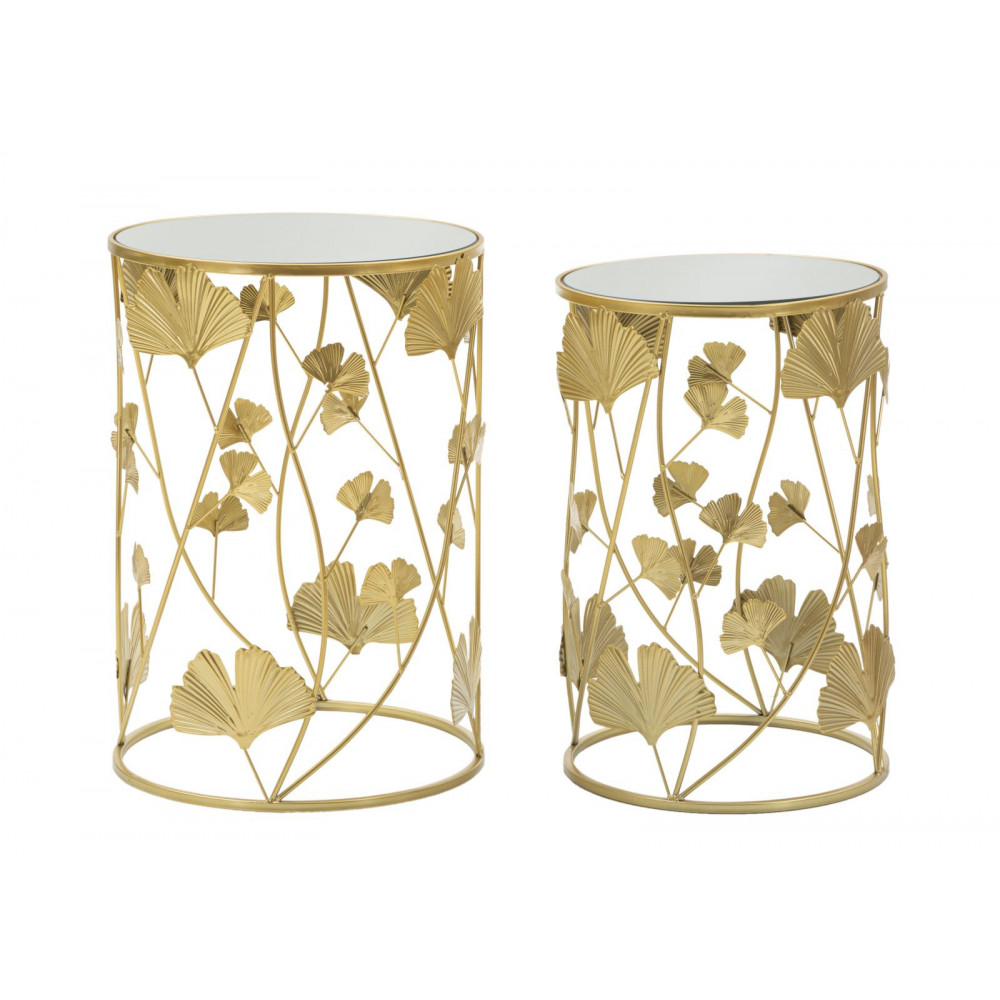 Coppia di tavolinetti rotondi in metallo dorato con piano in vetro a specchio. La particolare ed elegante decorazione composta da foglie dona un tocco di unicità all'articolo.