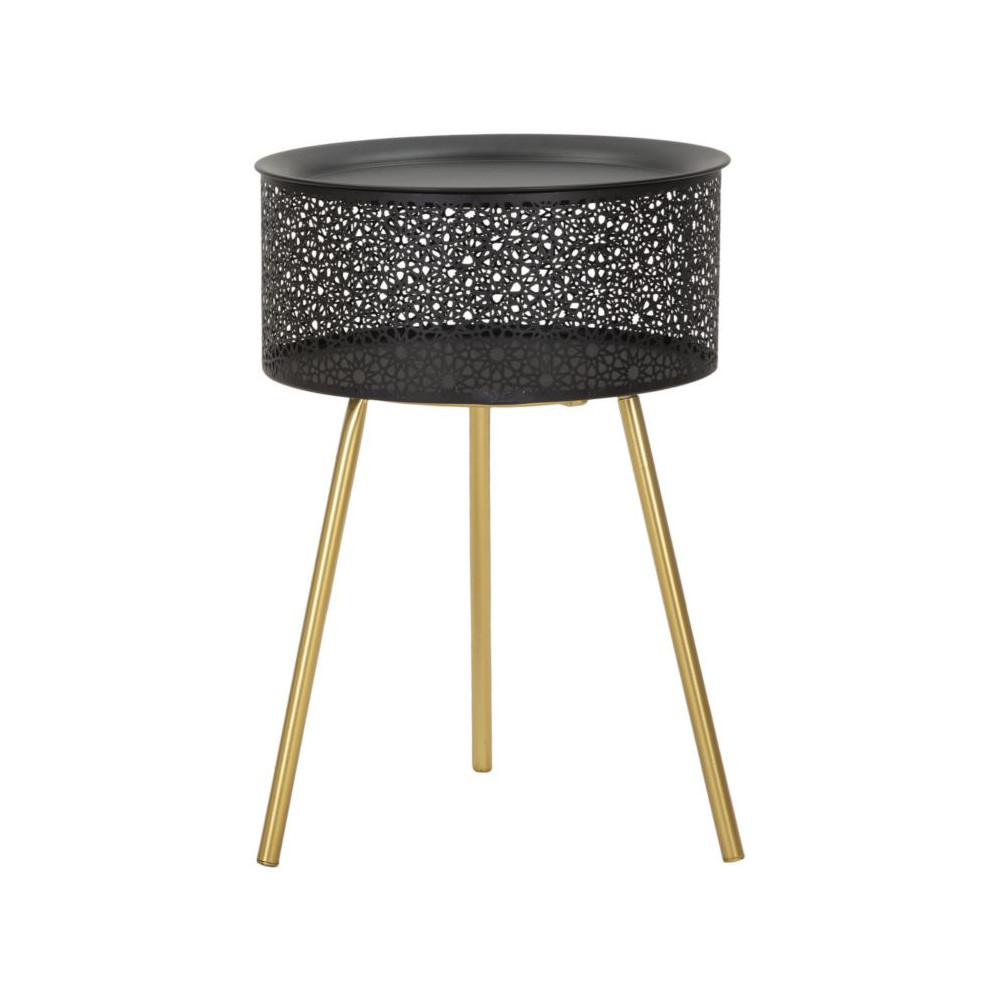 Tavolinetto rotondo in metallo nero con gambe dorate. La parte superiore è finemente intagliata per donare un tocco di eleganza. Il top è removibile, all'interno è presente un pratico contenitore.