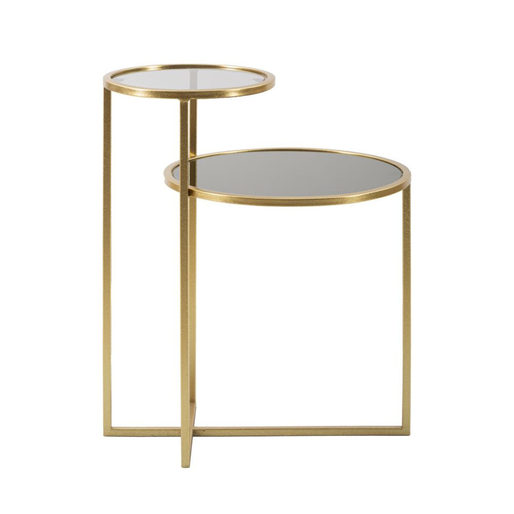 Tavolo da caffè su due livelli con struttura in metallo dorato dalle linee essenziali e geometriche. I due piani sono realizzati in vetro fumé