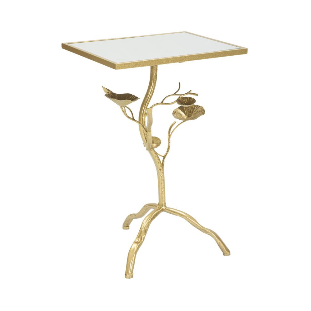 Tavolinetto quadrato in metallo dorato dalla struttura che richiama un albero e piano in vetro a specchio.