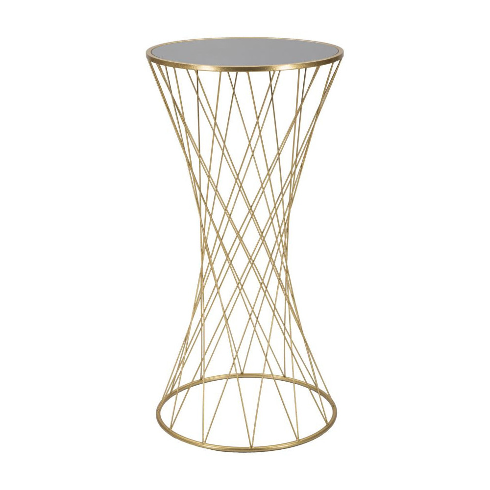 Tavolinetto rotondo in metallo dorato dalla struttura semplice e dalle linee essenziali con piano in vetro a specchio.