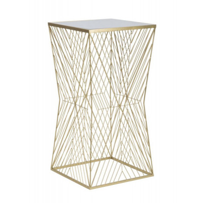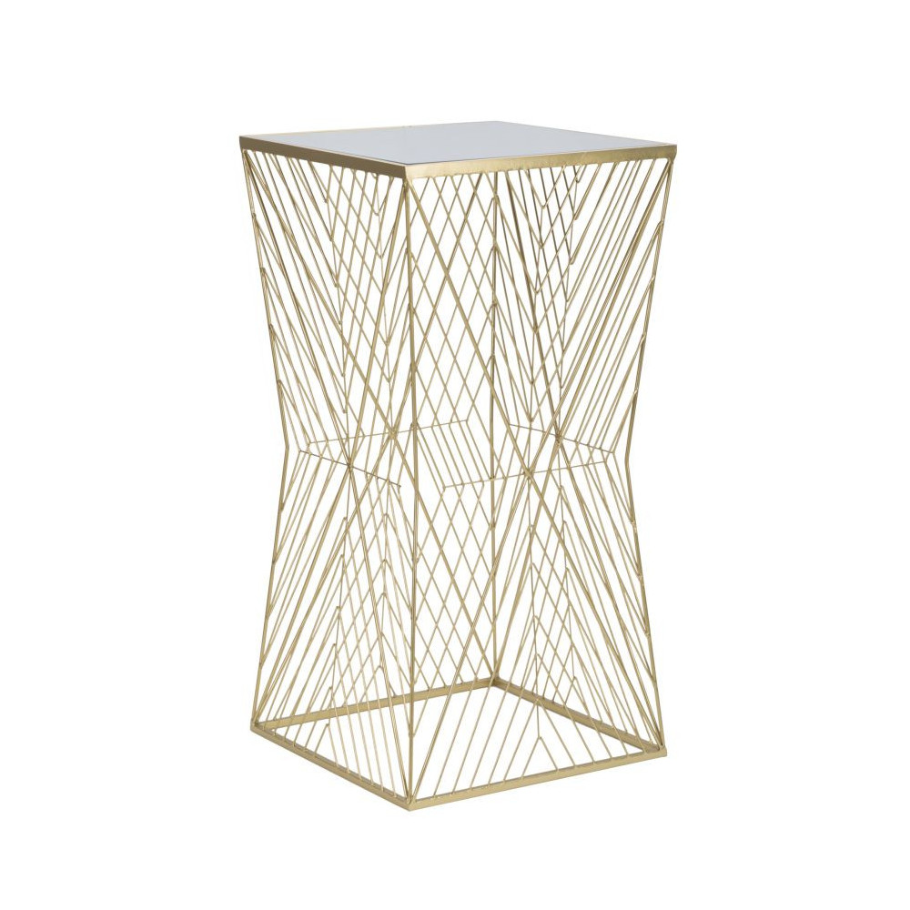 Tavolo portatelefono quadrato in metallo dorato dalle linee geometriche che creano un perfetto intreccio. Completo di piano in vetro a specchio.