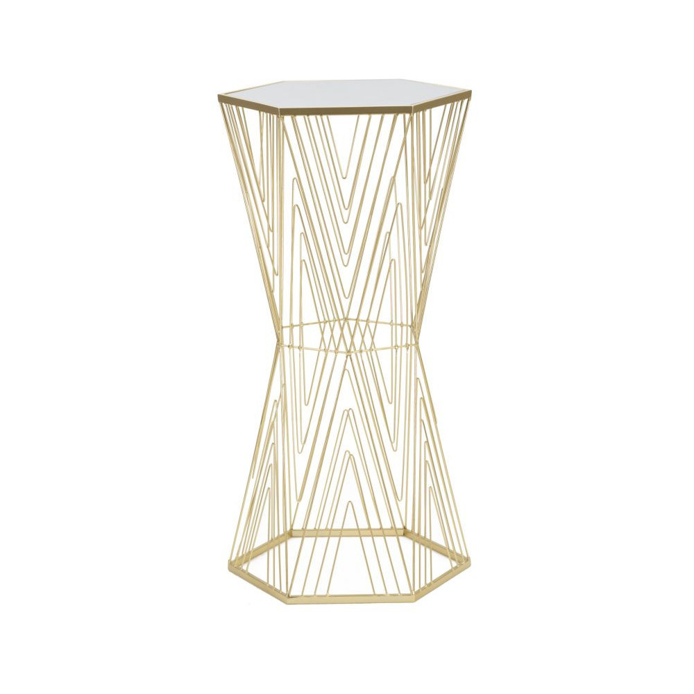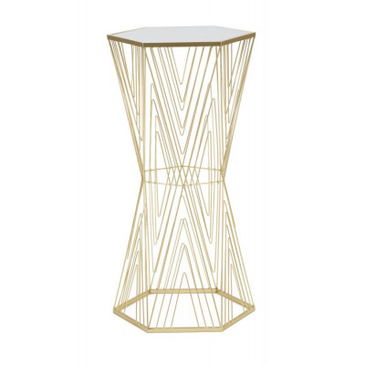 Tavolo portatelefono esagonale in metallo dorato dalle linee geometriche che creano un perfetto decoro. Completo di piano in vetro a specchio.