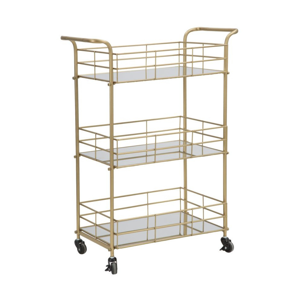 Carrello rettangolare in metallo dorato con tre ripiani in specchio. Un tocco d'oro non può mancare in una casa glam. Il carrello con ripiani specchiati è un elemento che diventa un punto luce in ogni ambiente