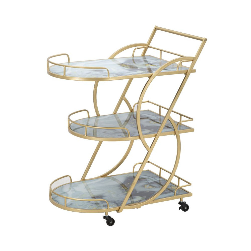 Carrello portavivande con struttura in metallo dorato con 3 ripiani in vetro realizzati con lavorazione simil marmo. Il design geometrico composto da 2 semicerchi e il contrasto dei colori donano un tocco di eleganza.
