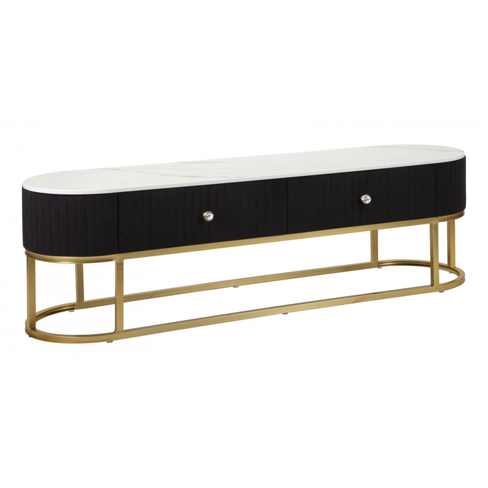 Mobile porta tv con i lati smussati con cassetto. La struttura in metallo dorato, la parte superiore rivestita in tessuto imbottito nero e il piano realizzato in simil marmo creano un elegante contrasto che può essere abbinato a qualsiasi tipologia di arredo.