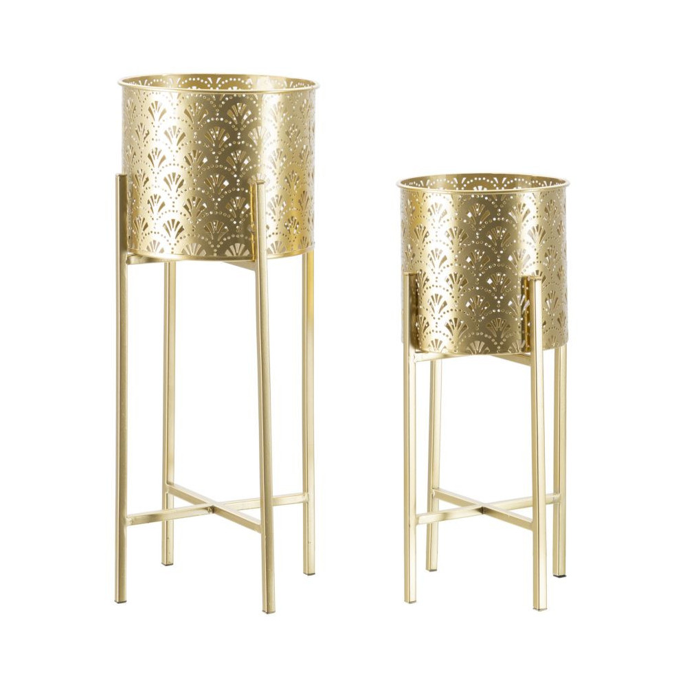 Coppia di portavasi rotondi in metallo dorato con intagli, completi di piedistallo. Il portavasi è removibile.