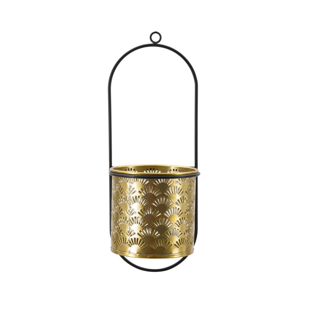 Portavasi da parete in metallo dorato finemente intagliato con decorazioni geometriche e supporto in metallo nero. Il vaso è removibile.