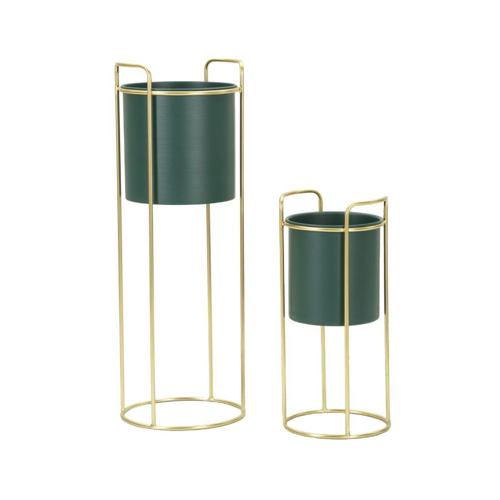 Set di due porta vasi verde con base dorata, elegante e moderno, ideale per valorizzare piante con stile e raffinatezza.