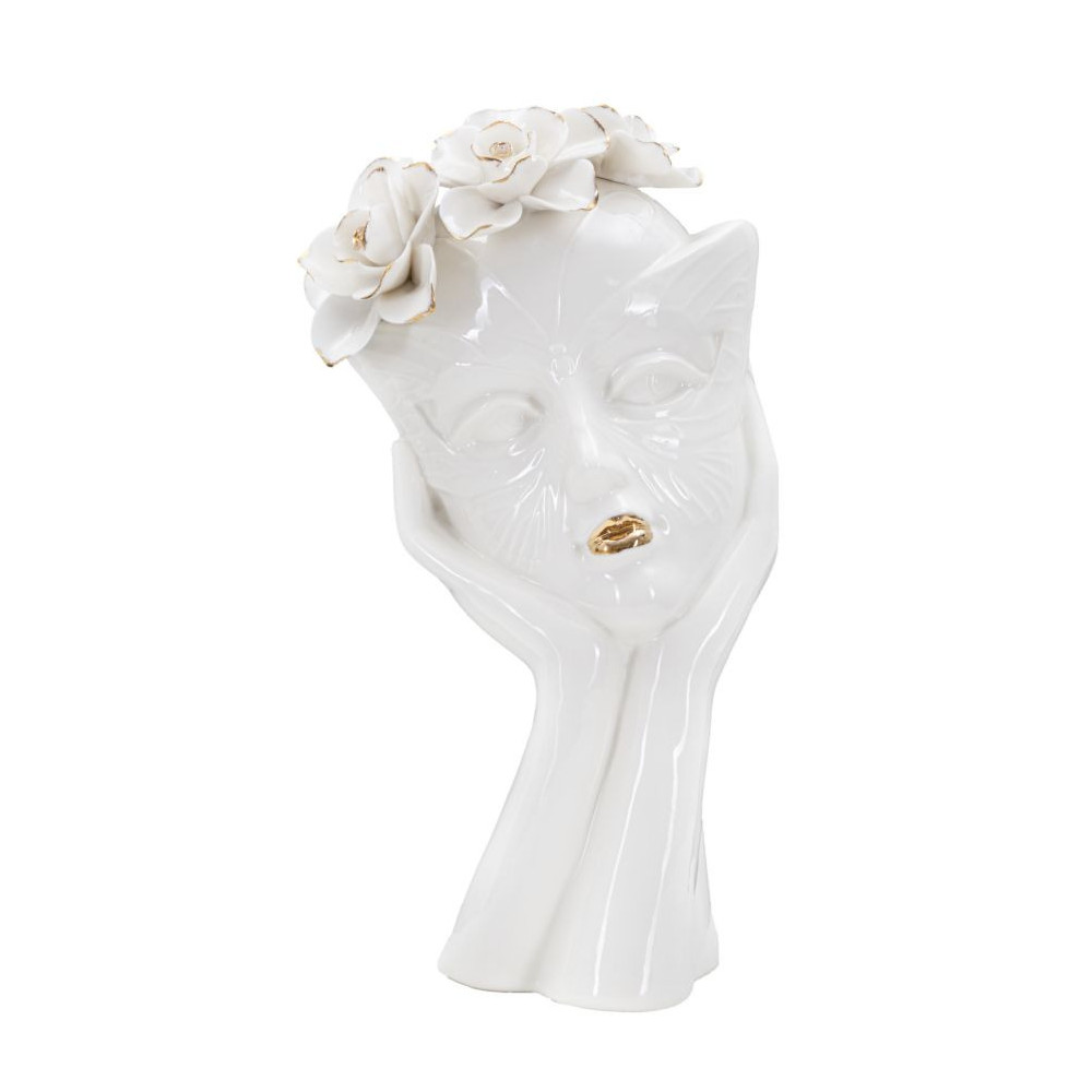 Vaso a forma di volto di donna con una corona di fiori e con una maschera che richiama il carnevale veneziano. Le decorazioni dorate donano un tocco di lucentezza e classe.