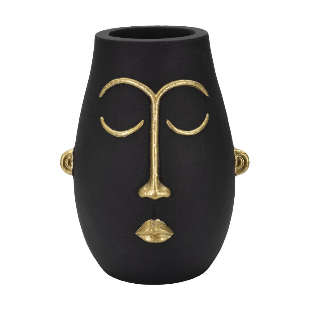 Vaso raffigurante un volto stilizzato con eleganti tratti dorati ispirato alle tribù primitive.