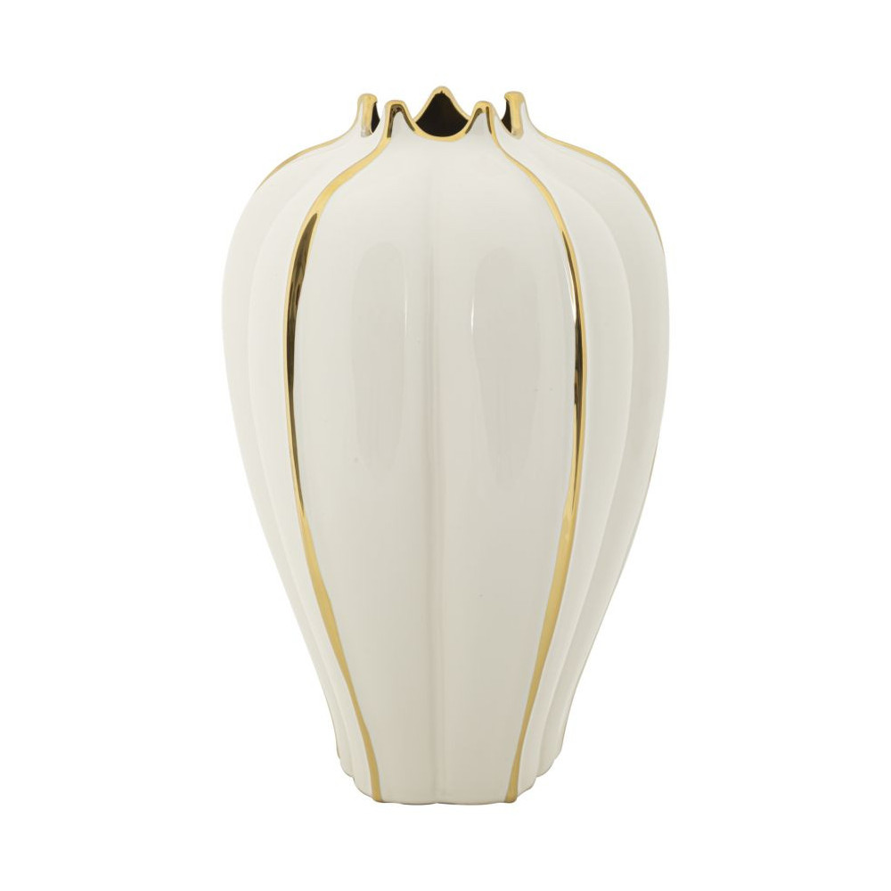 Vaso in ceramica bianca con eleganti finiture dorate dal design che richiama un bocciolo di fiore.