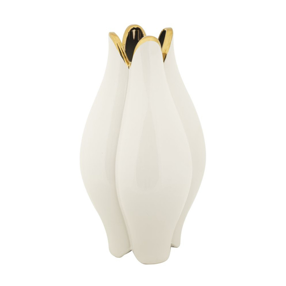 Vaso in ceramica bianca con eleganti finiture dorate dal design che richiama un bocciolo di fiore.