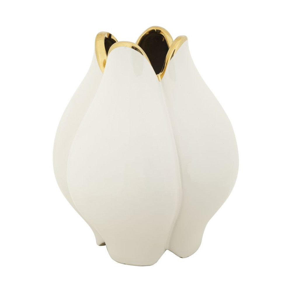 Vaso in ceramica bianca con eleganti finiture dorate dal design che richiama un bocciolo di fiore.