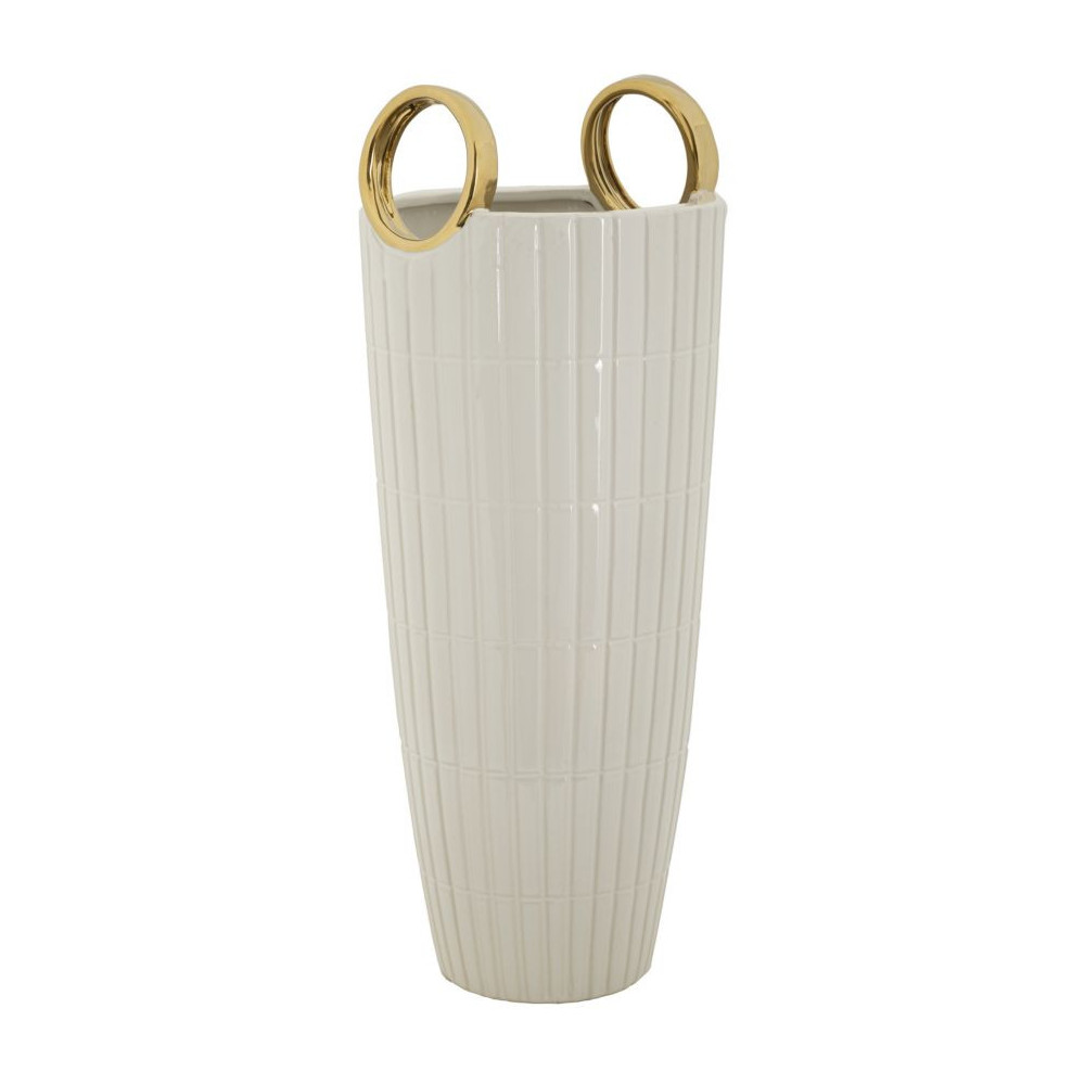 Vaso in ceramica bianca con eleganti quadretti in rilievo, impreziosito da due anelli dorati.