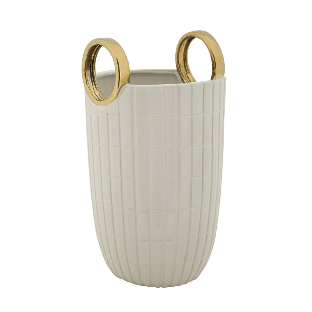 Vaso in ceramica bianca con eleganti quadretti in rilievo, impreziosito da due anelli dorati.