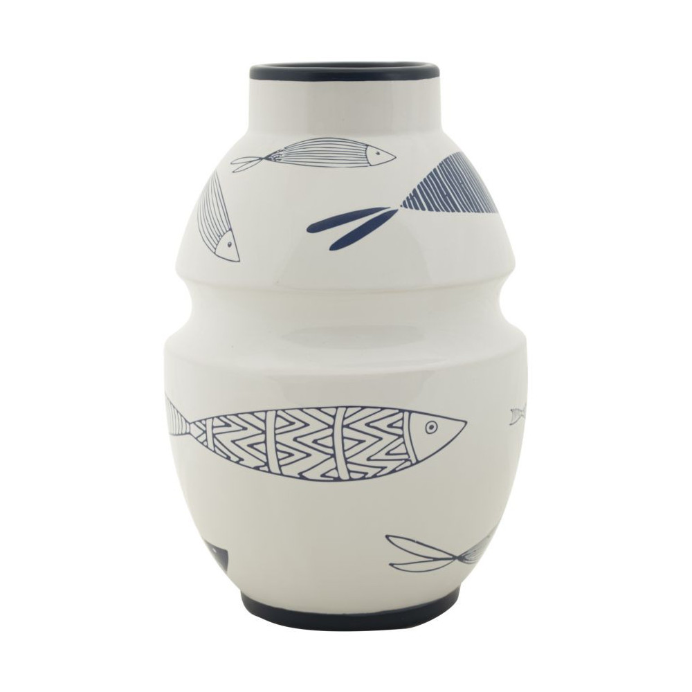 Vaso in ceramica bianca con pesci e decorazioni blu che creano un insieme che richiama il mare.