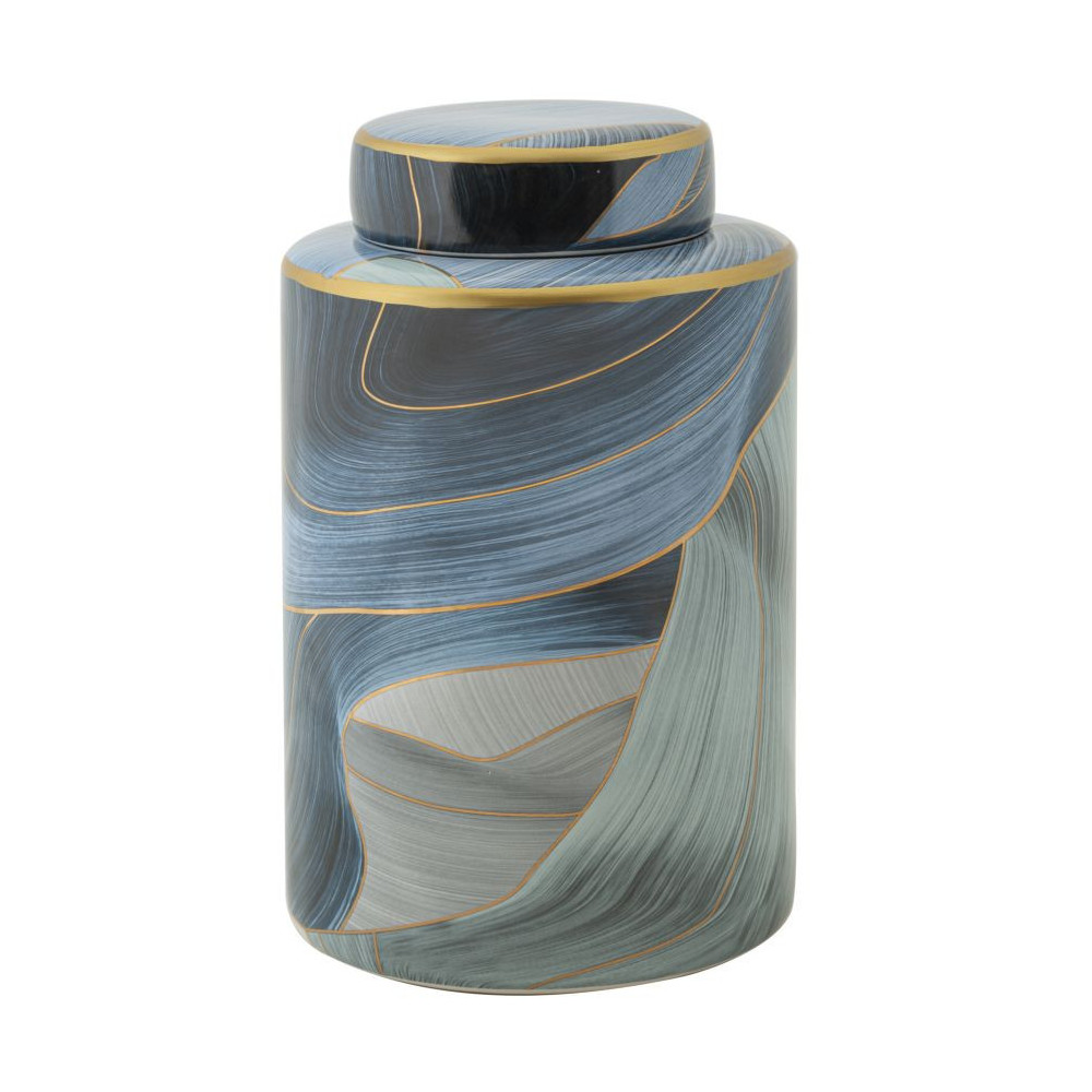 Vaso in ceramica con decorazioni che richiamano i petali dei fiori ed eleganti finiture dorate. Completo di coperchio.