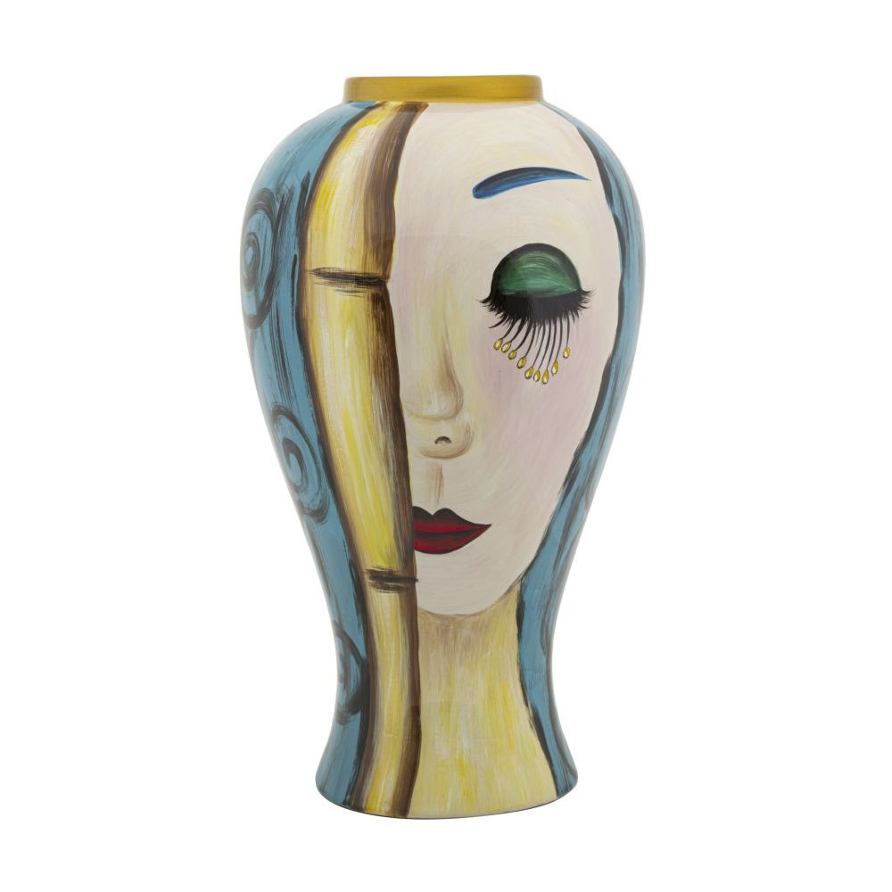 Vaso in ceramica dipinta raffigurante un volto dai tratti cubisti e impreziosito da decorazioni dorate.