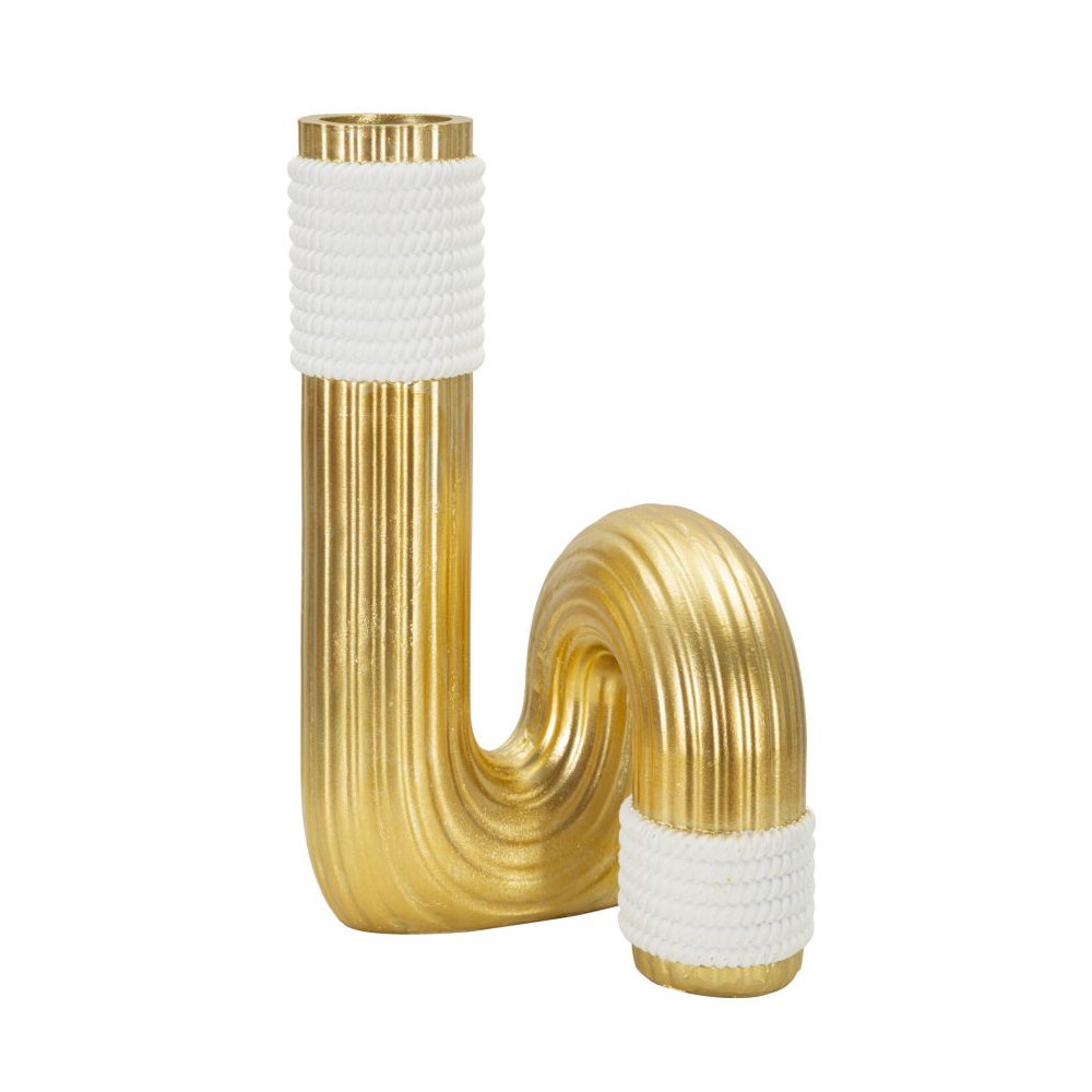 Elegante vaso in resina dorata con finiture bianche dalle linee morbide e sinuose.