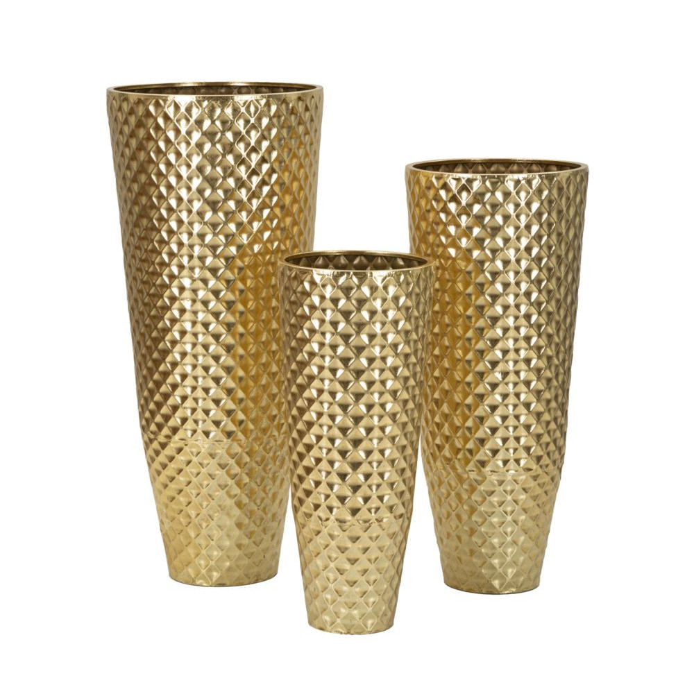 Set di 3 eleganti vasi dorati, con trama geometrica in rilievo perfetti per decorare ogni ambiente con stile e raffinatezza. Ideali per piante o come elementi decorativi singoli.