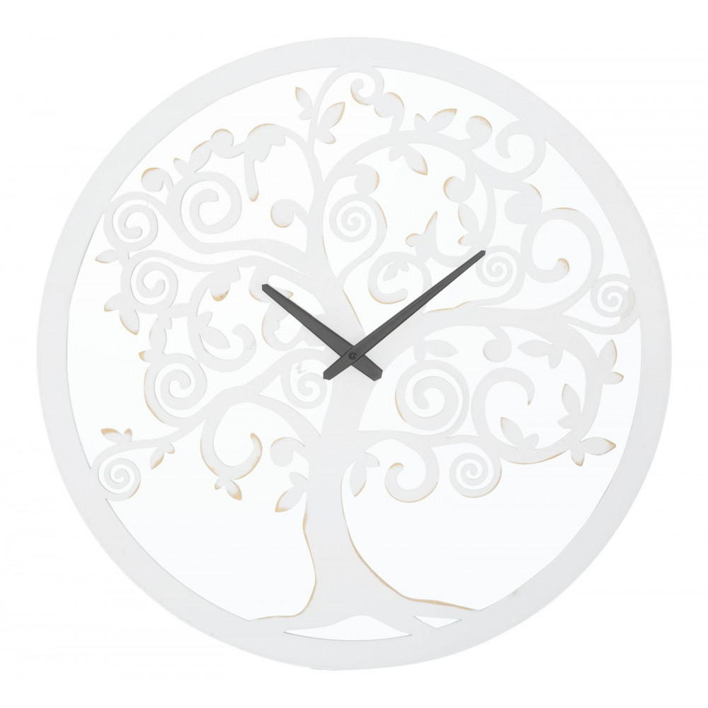 Elegante orologio rotondo da parete in metallo bianco e specchio. Il design ad albero richiama la natura e dona un tocco di classe ad ogni ambiente.