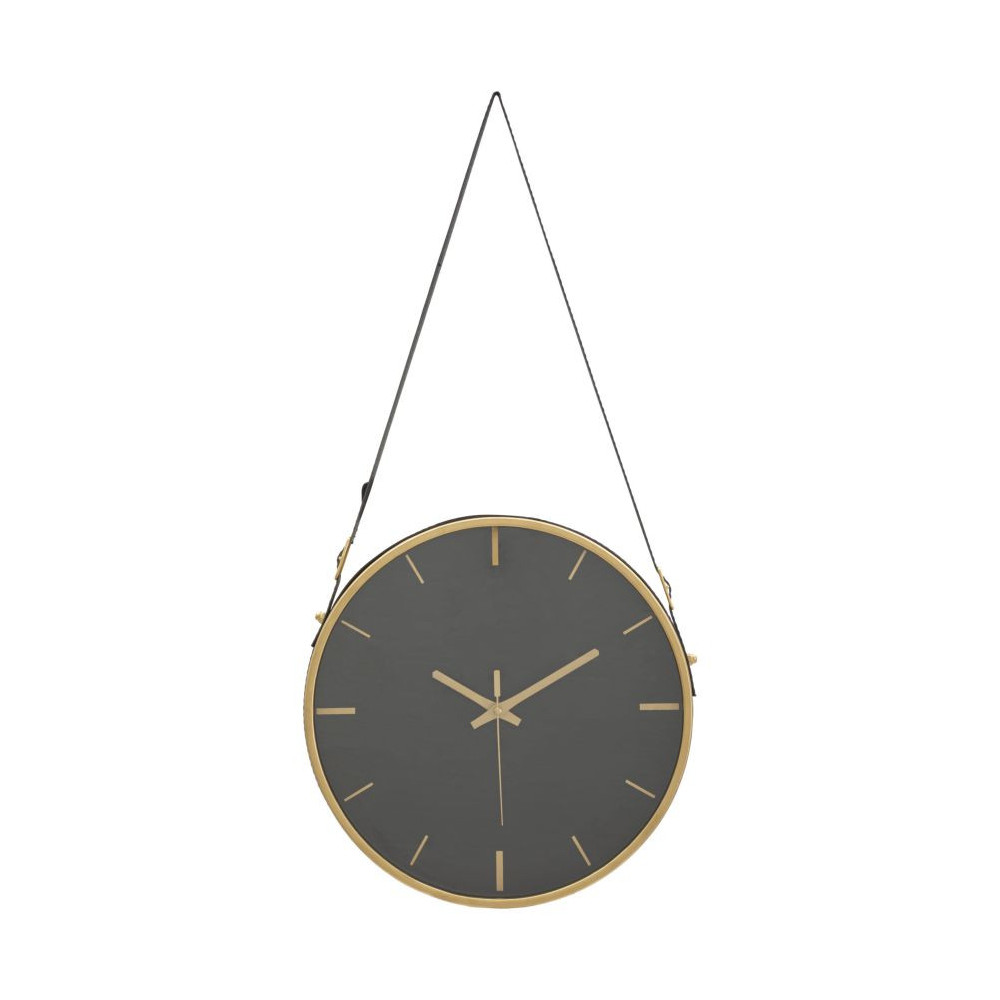 Orologio da parete dalle linee essenziali e classiche con particolare cinghia superiore per appenderlo al muro.