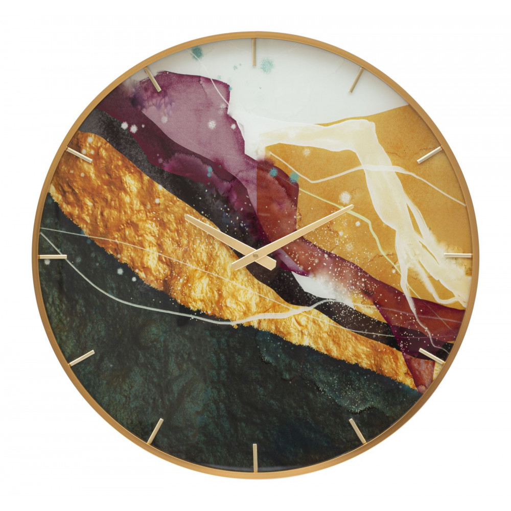 Orologio rotondo da parete con elegante cornice dorata e quadrante decorato con tonalità vivaci e accese.