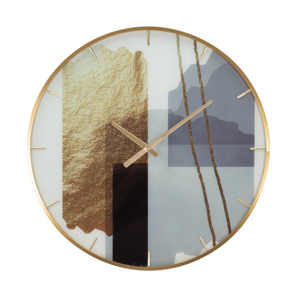 Orologio rotondo da parete con elegante cornice dorata e quadrante decorato con tonalità vivaci e accese.