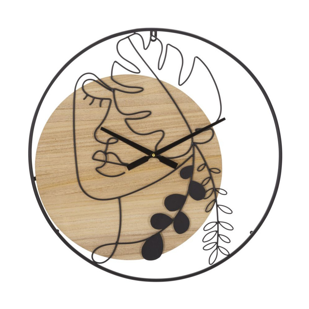 Orologio rotondo da parete in metallo e legno dalle linee morbide e sinuose che compongono un volto e delle foglie. Funzionamento con batteria AA non inclusa.