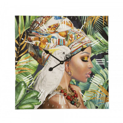 Orologio da parete raffigurante una donna con un pappagallo in un ambiente naturale. I colori accesi e vivaci e le eleganti applicazioni in tessuto donano un tocco di eleganza. Funzionamento con batteria AA non inclusa.