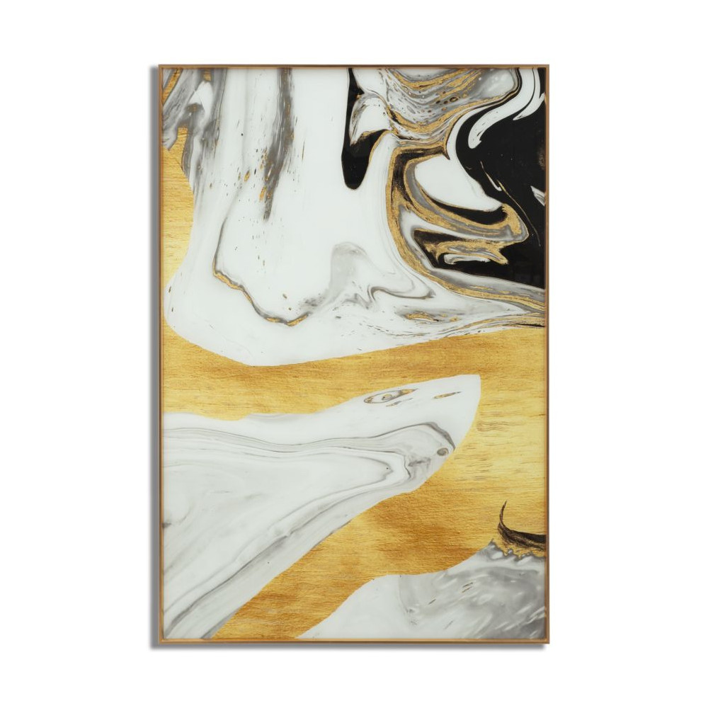 Pannello decorativo in vetro con eleganti decorazioni astratte. Il pannello è racchiuso in una semplice cornice di metallo dorato.