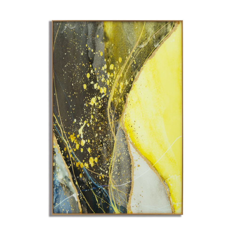 Pannello decorativo in vetro con eleganti decorazioni astratte. Il pannello è racchiuso in una semplice cornice di metallo dorato.