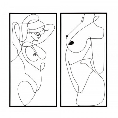 Coppia di pannelli decorativi 3D in metallo dalle linee che si intersecano a creare dei corpi di donna. Il design richiama il simbolismo e l'astrattismo.