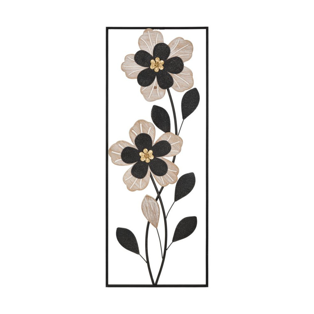Pannello decorativo 3D da parete in metallo e legno composto da eleganti fiori racchiusi in una cornice rettangolare in legno.