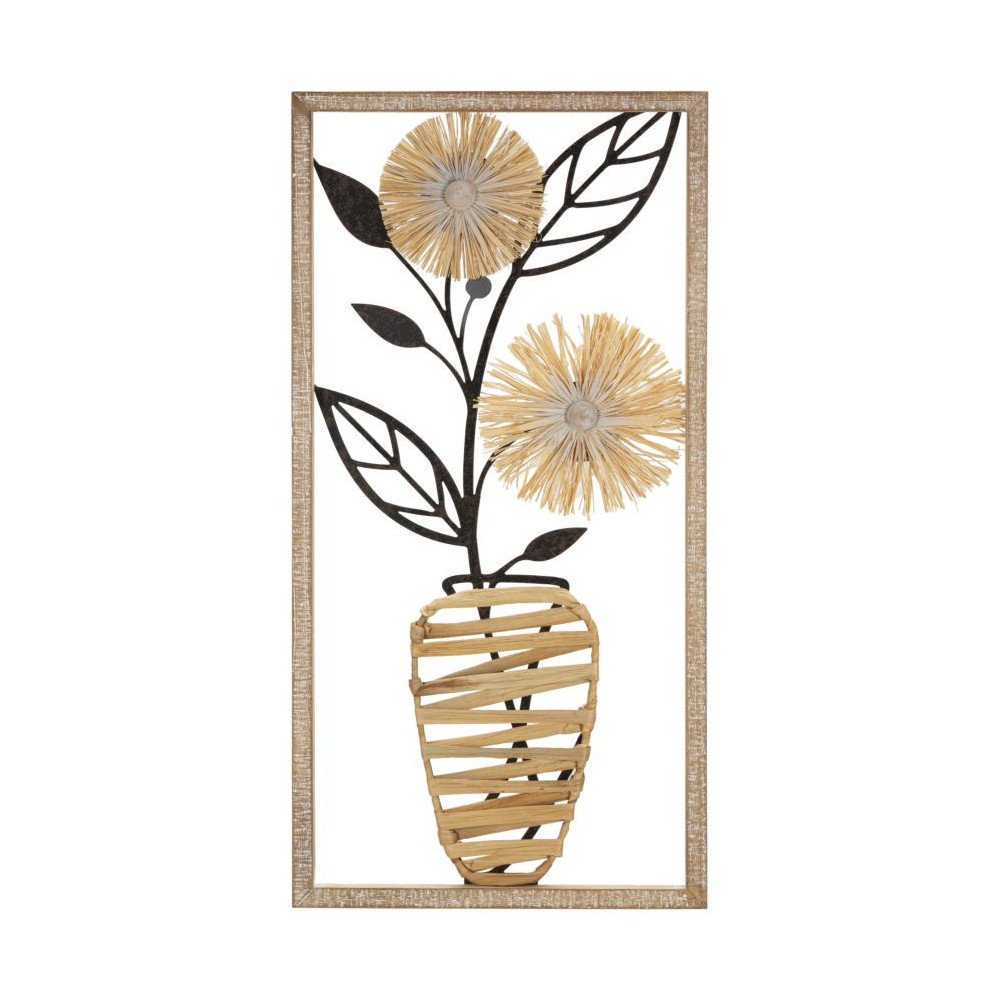 Pannello decorativo 3D da parete in metallo e legno composto da un vaso di fiori racchiusi in una cornice rettangolare in legno.