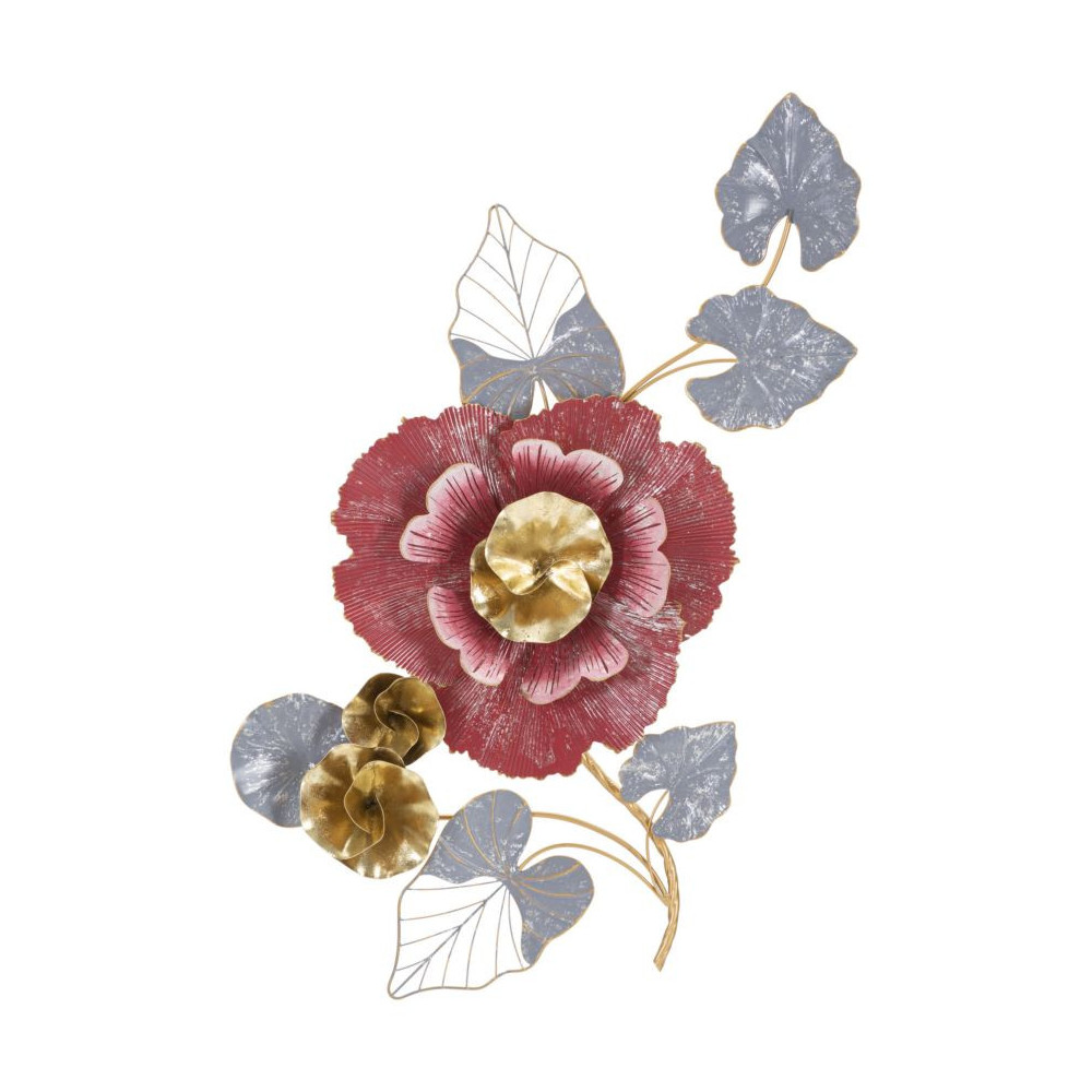 Pannello decorativo 3D da parete in metallo raffigurante un fiore dai colori accesi e delle foglie.