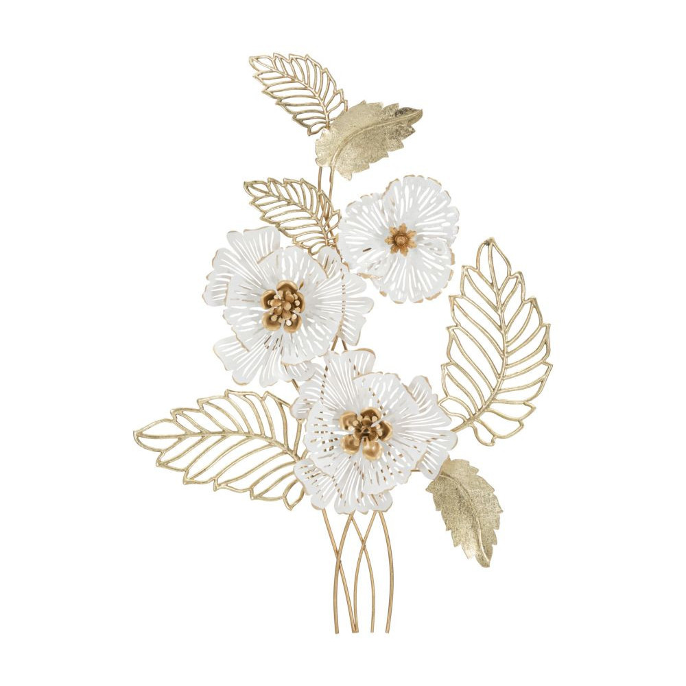 Pannello decorativo 3D da parete in metallo composto da rami e foglie dorate con fiori bianchi e dorati.