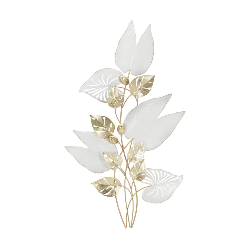 Pannello decorativo 3D da parete in metallo composto da rami con foglie bianche e dorate.