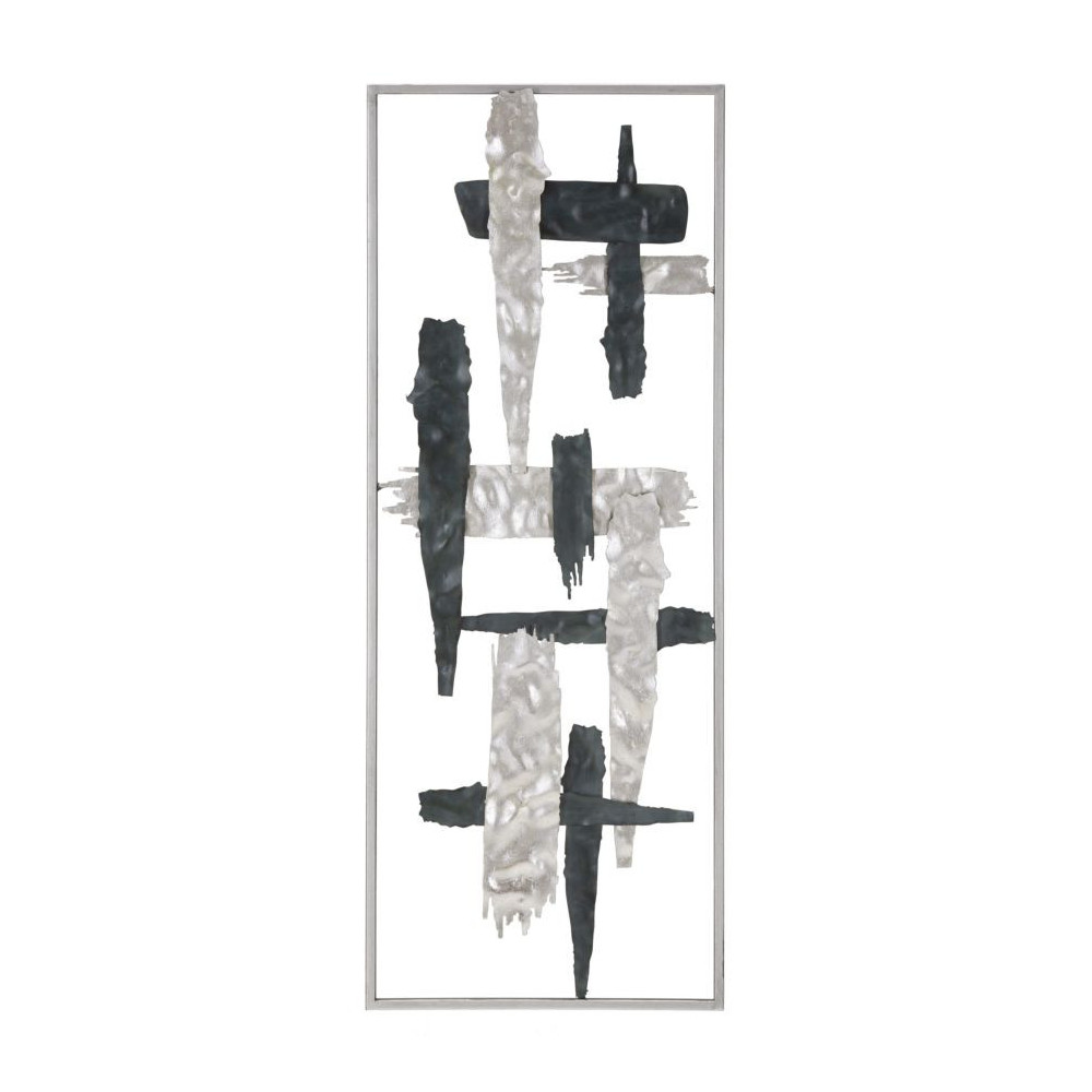 Pannello decorativo 3D da parete in metallo composto da figure astratte in un'elegante cornice rettangolare.