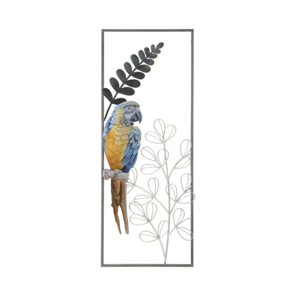 Pannello decorativo 3D da parete in metallo composto da un pappagallo colorato su ramo con foglie in un'elegante cornice rettangolare.